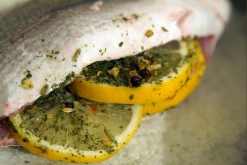 Am mai facut-o o data, dar repetitia asta pare ca ne prieste. Asa ca am luat doua dorade de juma’ de kil fiecare (cam 30 de lei/kg) si pentru ca m-am trezit singura acasa, a trebuit sa le si curat. Asa ca le-am spintecat si le-am scos matzele. I know.. nici eu nu pot sa zic ca mi-a placut, dar am supravietuit. Asa ca daca treci de partea asta, ia o lamaie, tai-o felii si indeas-o-n burta animalului. Merg si niste condimente – in cazul de fata: sare de mare, fenicul, piper negru, patrunjel.