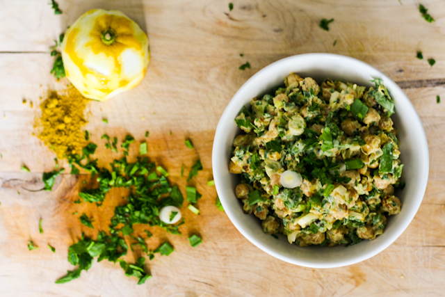Fix la final am pus si 1 catel de usturoi maruntit si coaja rasa de la 1 lamaie. Am amestecat si am luat tigaia de pe foc. Am pus nautul intr-un bol si cat s-a mai racit m-am ocupat de dressing: 3 linguri de iaurt le-am amestecat cu 1 lingura de pudra de curry (eu am folosit un mix Madras picant care zacea printr-un borcan, dar feel free sa va jucati cu ce masala vreti), sucul de la jumatate de lamaie si sare. Am turnat dressingul peste naut, am mai presarat 1 legatura de patrunjel si 2 fire de cepe verzi taiate marunt, am amestecat si cam asta a fost pranzul de azi.